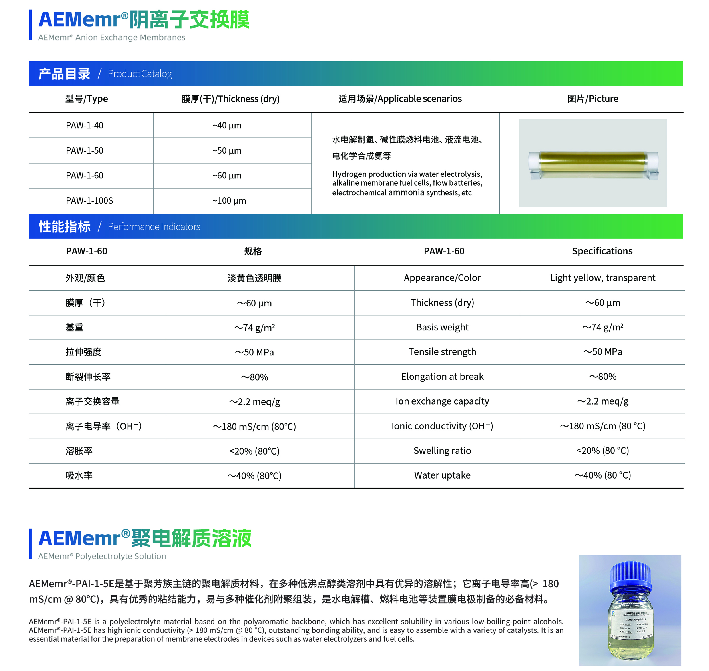 中国贝博氢友专注于阴离子交换膜的研发、生产与销售。其开发的AEMemr®系列产品已实现卷对卷连续生产,具有离子传导率高(180 mS/cm,OH¯形式,80°C)、碱稳定性高(10000+ h,1 M KOH,80°C)和机械强度高(50 MPa stress,>80% strain)等特点,可应用于水电解制氢、碱性膜燃料电池、液流电池、电化学合成氨以及水处理等多个领域。