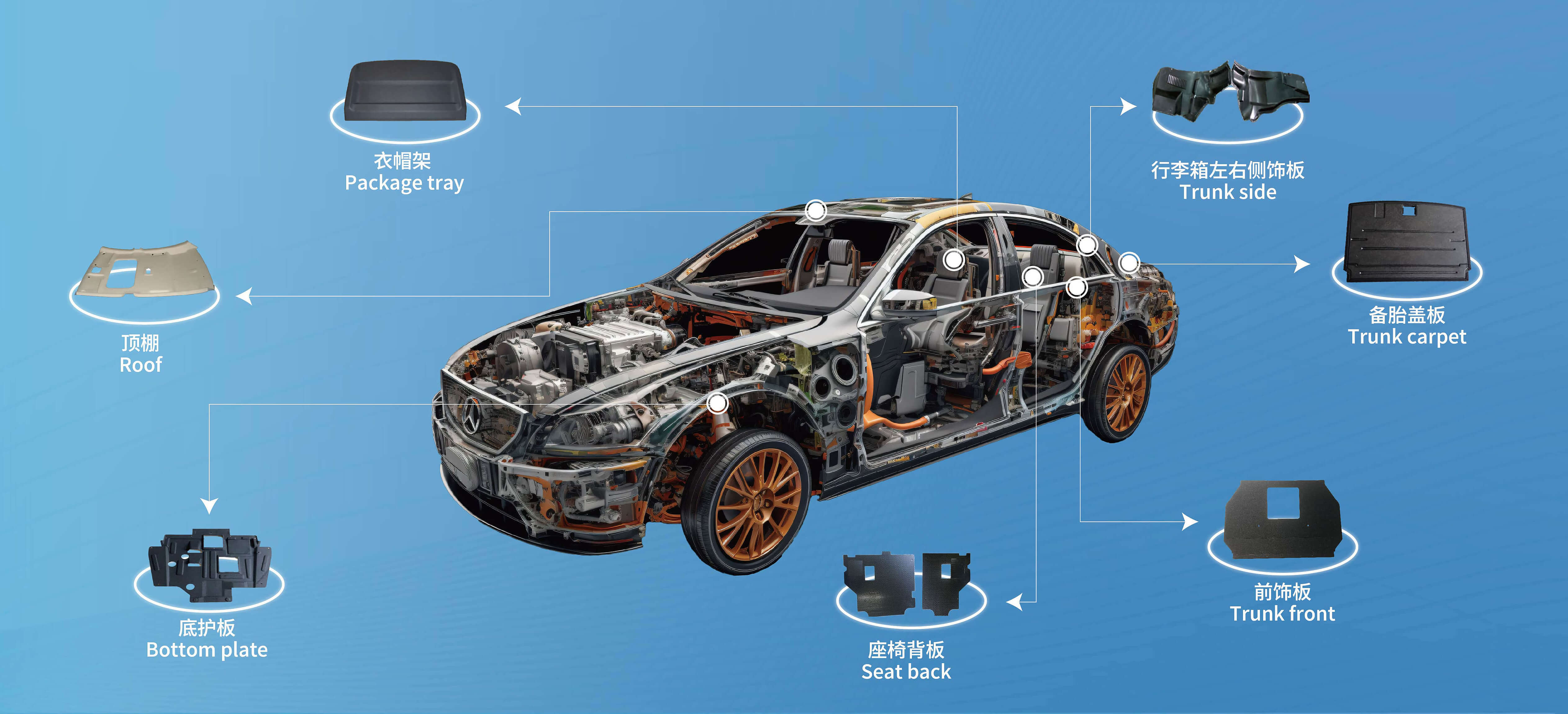 主要用途: 汽车内饰;底护板、顶棚、衣帽架、遮物帘;乘用车行李箱备胎盖板、乘用车行李箱衬板、乘用车座椅背板、客车顶板、周转箱等