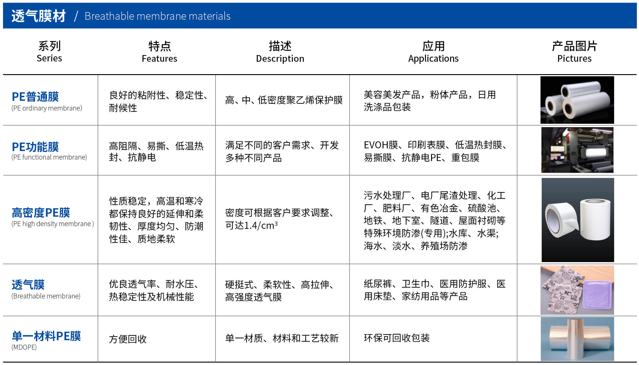 产品介绍:PE透气膜是一种新型高分子防水材料。采用导热油加热的方式,传热性能好,能耗低,可使流延机上的材料受热更均匀,增加材料的塑性。工艺设备改为双螺杆多层共挤出方式,单螺杆挤出方式改为双螺杆多层共挤出方式,使挤出量大幅增加、材料搅拌更均匀,产品品质更优异。应用于医疗卫生领域,具有透气、防水等特点,可以增加人体舒造性,达到隔绝病毒、细菌的作用。