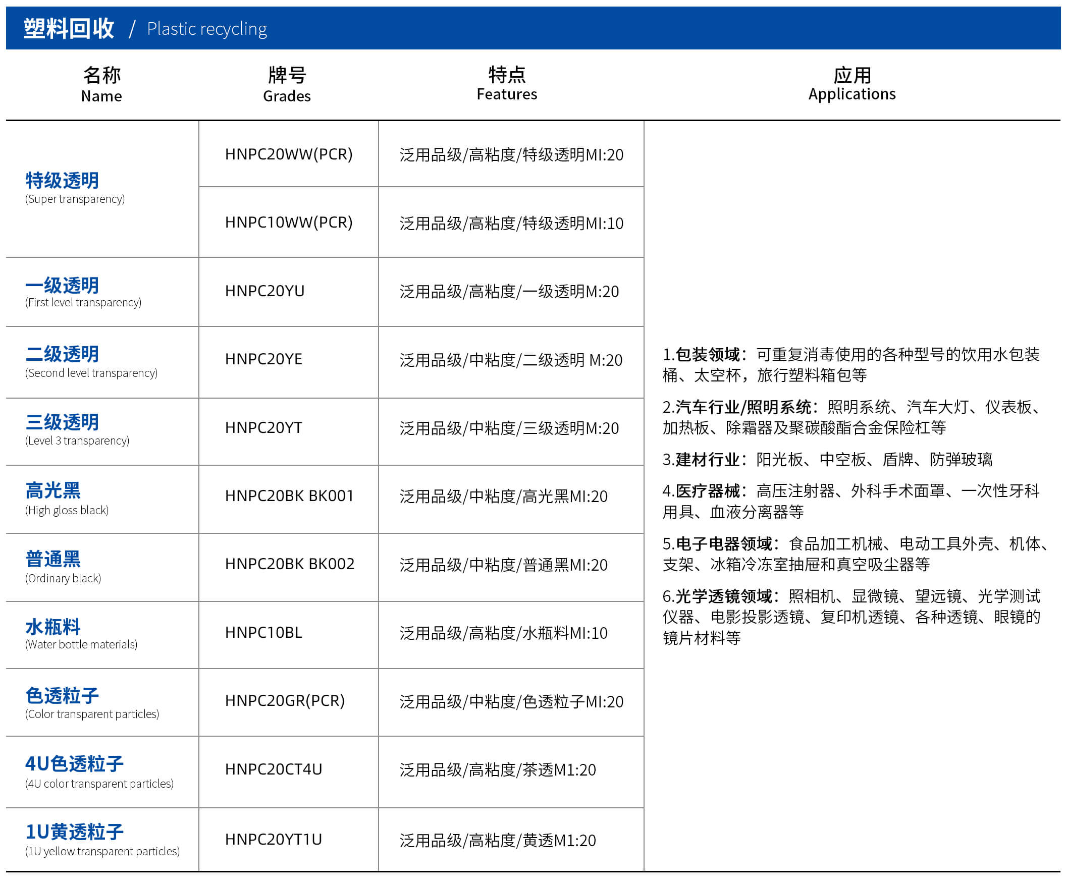 产品介绍:bb集团有限公司循环板块聚碳酸酯塑料回收再生产品拥有特级透明、一级透明、二级透明、三级透明、高光黑、普通黑、水平料、色透粒子、4U色透粒子、1U黄透粒子十余种产品系列。产品广泛应用于包装领域、汽车行业照明系统、建材行业、医疗器械、电子电器领域、光学透镜领域等。